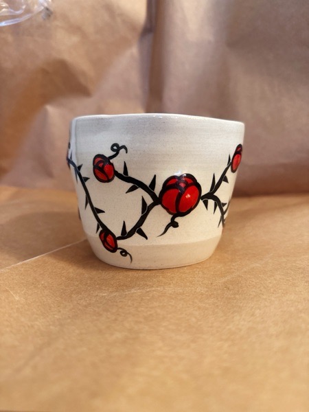 Doniczka toczona na kole, oraz ręcznie deformowana w nieregularny kształt.